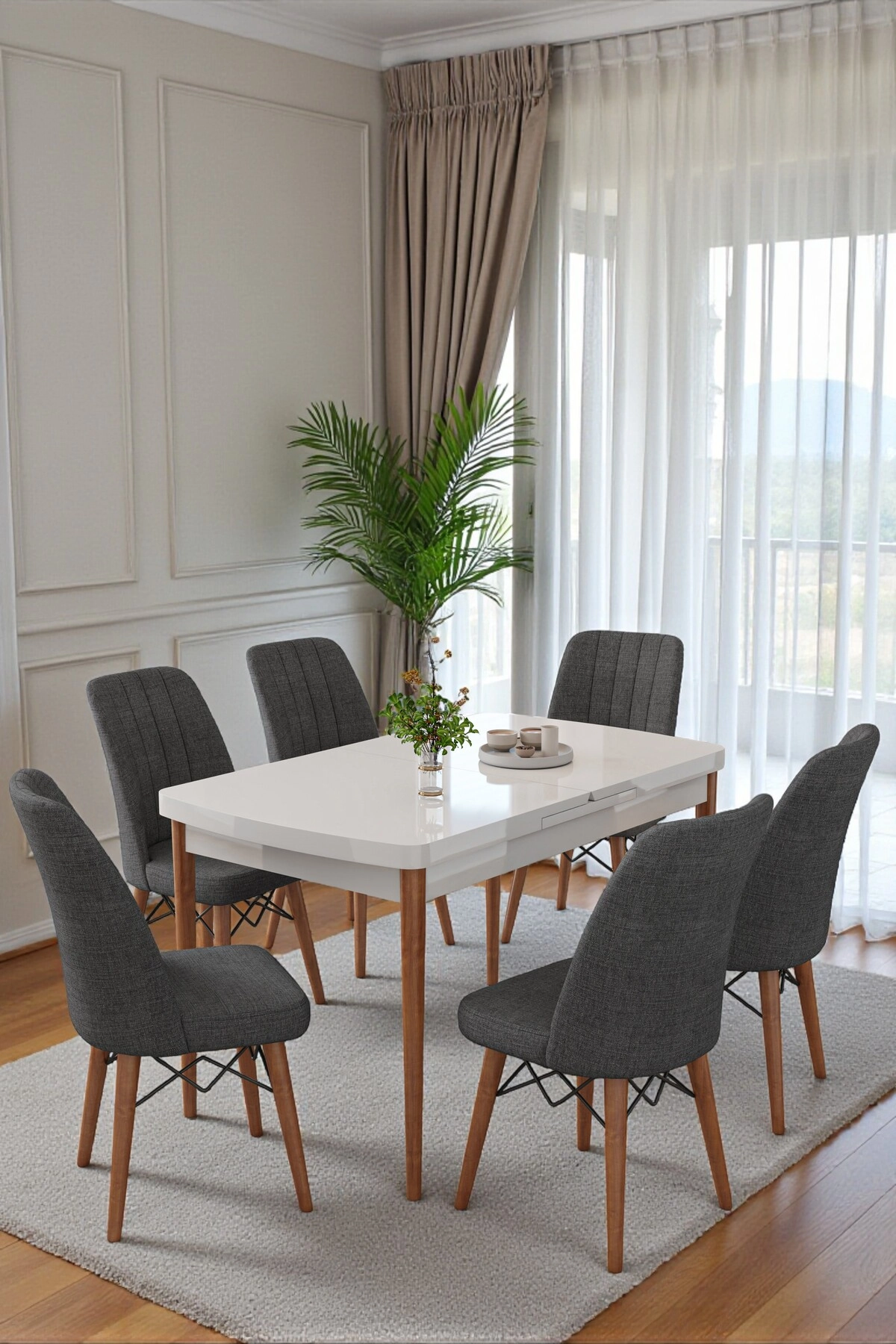 Şık tasarımı ve dayanıklı yapısıyla 6 kişilik açılır masa sandalye takımı, mutfak, salon ve yemek odaları için ideal bir seçimdir.